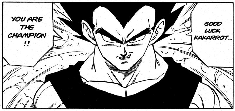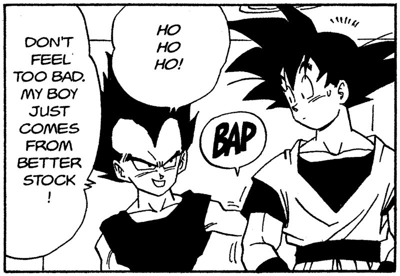 Si estamos hablando de una escena cómica, me gusta la frase: "¡Jo, jo, jo! No te sientas tan mal. ¡Mi hijo es de mejor estirpe!". Te da una idea de los cambios por los que pasó Vegeta mientras vivía en la Tierra, y me gusta el sentimiento detrás de esto.