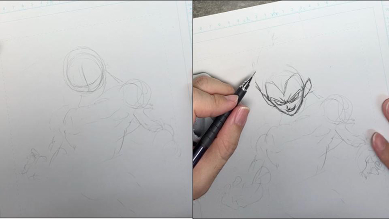 Esta vez no imprimí a Majin Vegeta en azul, sino que entinté el boceto directamente. Dado que era solo una hoja y no un capítulo de manga completo, borrar las líneas no fue mucho trabajo.