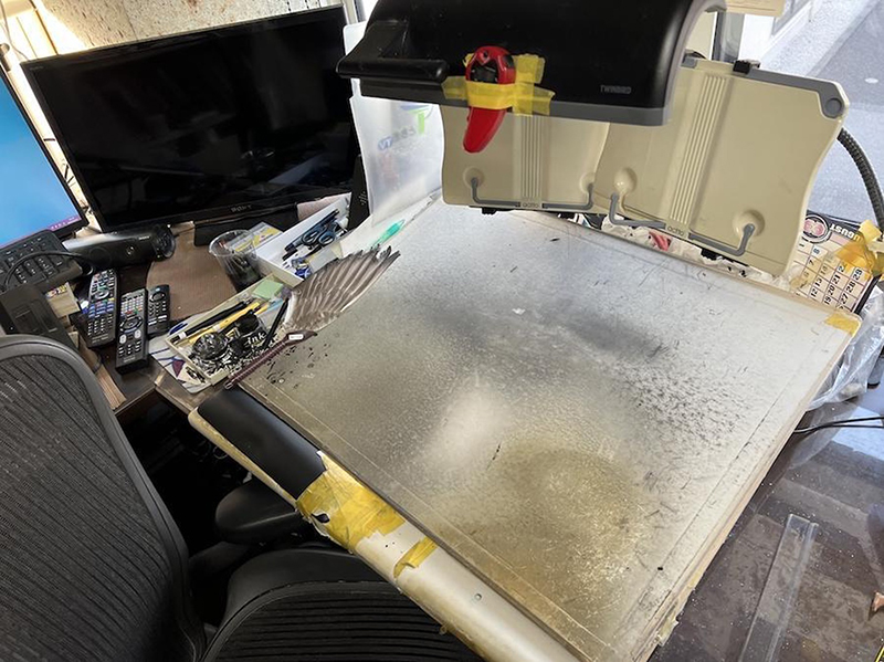 Una foto del escritorio de trabajo de Toyota. El televisor que mencionó y sus controles remotos están en el lado izquierdo de la mesa.