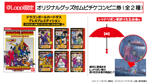 El bono Carddass es un conjunto de 6 tarjetas súper geniales que presentan obras de arte de personajes de la nueva película, mientras que el elegante mango del paraguas tiene la forma del logotipo distintivo del Ejército de la Cinta Roja. ¡¡Asegúrate de reservar tus entradas en las tiendas Lawson a través de sus terminales multimedia Loppi ahora!!