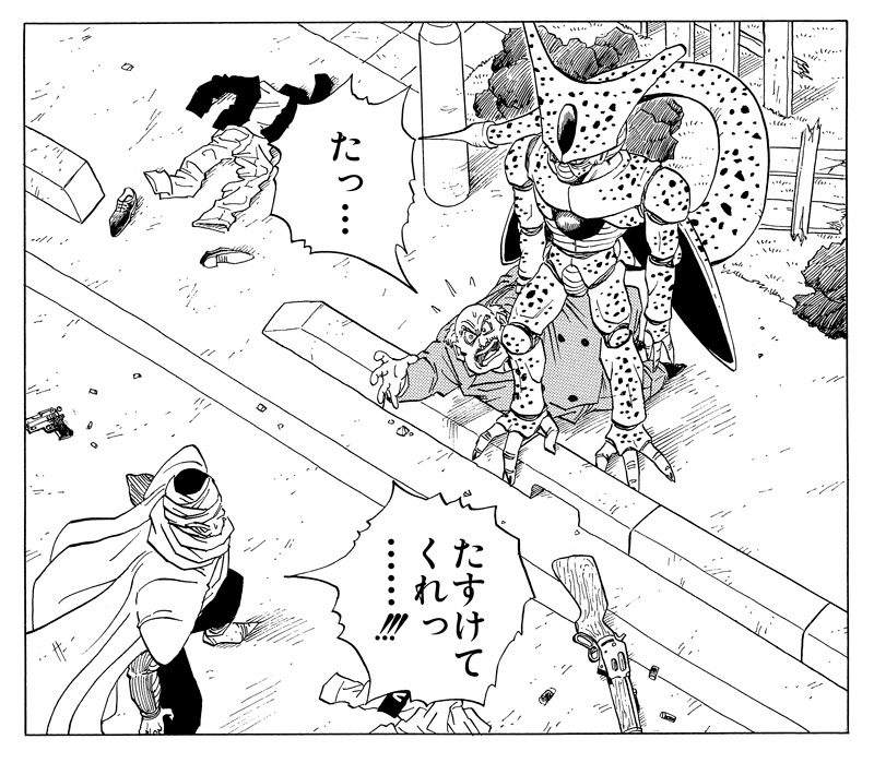 Una criatura desconocida aparece en Ginger Town, todas las personas han desaparecido misteriosamente, dejando atrás solo su ropa siniestramente esparcida. De repente, el autoproclamado pez gordo de la ciudad sale y comienza a pedir ayuda a Piccolo . "¡Te daré cualquier cosa! ¡Yo—!" Y luego¡puñalada! La cola de Cell atraviesa su espalda. ¡Eso es bastante traumático cuando eres solo un niño!