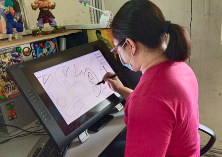 (Dibujando usando una tableta LCD. Las figuras de Dragon Ball alinean detrás del escritorio.