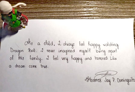 Comencé a ver el anime de Dragon Ball en la televisión cuando tenía 7 años. Escuché que Dragon Ball solo se transmite una vez a la semana en Japón, pero se transmite todos los días en Filipinas. La compañía de transmisión compra episodios de Japón en lotes y los reproduce uno tras otro todos los días. Entre lotes de nuevos episodios, reproducen los antiguos. Reproducen los episodios constantemente porque Dragon Ball es muy popular, y cada vez que los veía me enamoraba más de la serie. Ver a Goku hacerse más fuerte con cada batalla me hizo querer ser más fuerte como él. Goku es un superhéroe para mí.