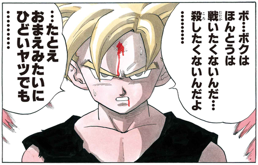 Inicialmente se niega a luchar contra Cell, ya que aunque sabe que liberar su ira es la clave para desbloquear su verdadero poder, algo le impide hacerlo.