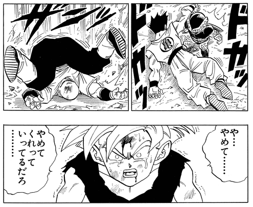 Gohan está angustiado, sabiendo que si hubiera acabado con Cell antes cuando Goku se lo dijo, nada de esto habría sucedido y su padre aún estaría vivo.