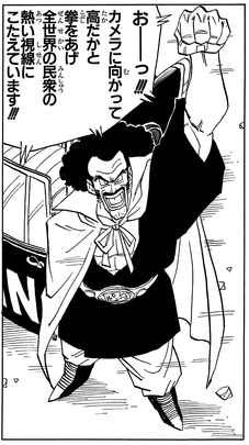 Mr. Satan llega al Cell Games Arena en un paseo elegante y no pierde el tiempo en declarar con orgullo su victoria una vez allí.