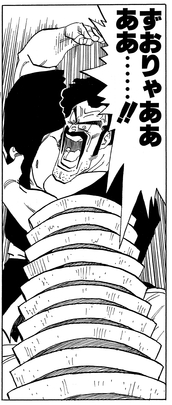 En un intento de intimidar a Cell, se muestra rompiendo una enorme pila de 14 baldosas de cerámica justo en frente del terror Bio-Android, luego señala los escombros y amenaza con hacerle lo mismo.