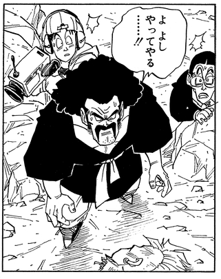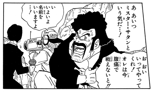 El campeón se queda estupefacto una vez que es testigo de la increíble fuerza de Goku y Cell y finge dolor de estómago para evitar pelear más.