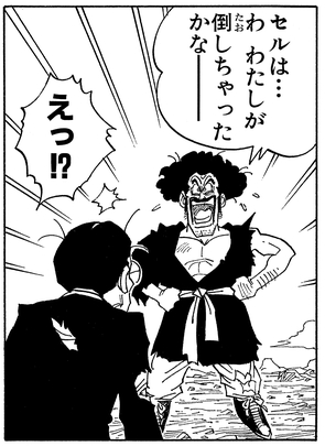 Después de que Gohan sale victorioso contra Cell, Mr. Satan declara en la televisión en vivo que en realidad fue él quien derrotó al villano Android.