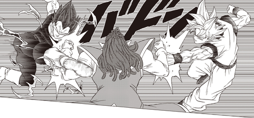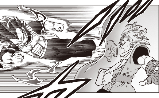 ¡ Vegeta usa su transformación Ultra Ego para enfrentarse a Gas! A pesar de estar en el extremo receptor de los ataques de Heeter, aprovecha la capacidad de su forma de usar el daño como combustible para cambiar y desarrollar su fuerza y comienza a lanzar algunos contraataques decisivos. Sin embargo, el daño finalmente pasa factura y Vegeta se derrumba. ¡Antes de que Gas pueda dar el golpe final, Goku salva a Vegeta y se transforma en su forma de Ultra Instinct de pelo negro!