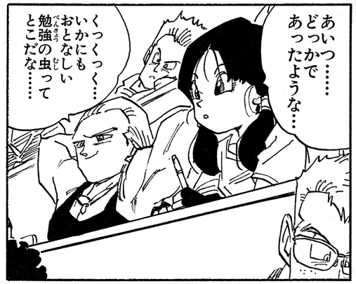 La primera vez que ve a Gohan es cuando el adolescente medio Saiyajin se une a su clase. Inicialmente, piensa muy poco en él, llamándolo "geek".