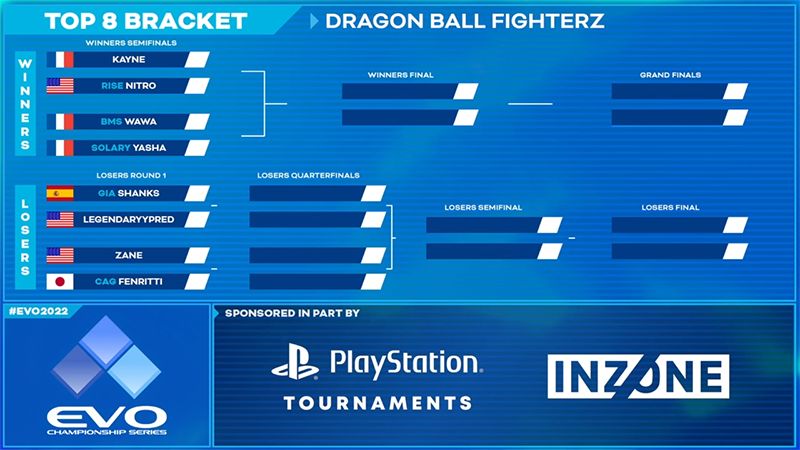 Los 8 mejores competidores. Esta alineación está compuesta por jugadores de todo el mundo que ganaron el derecho a representar a sus países en el Campeonato Mundial, incluidosWawa de Francia, que obtuvo victorias consecutivas en el Campeonato Mundial Dragon Ball FighterZ 2021-2022 celebrado en julio.
