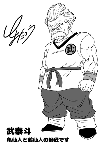 La primera obra de arte es un dos por uno de rostros frescos y familiares a la vez: ¡los jóvenes Kamesennin y Tsurusennin! Mientras Goku entrenaba en el Kami's Palace en la Sala del Tiempo, hizo un viaje temporal y los conoció a ambos en el pasado. Jóvenes o mayores, ambos lucen sus característicos anteojos de sol, y Tsurusennin pone su distintivo sombrero. Algunas cosas nunca cambian.