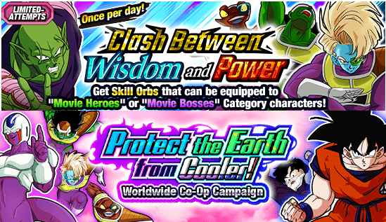 Echa un vistazo al evento de intentos limitados "Choque entre la sabiduría y el poder" en el que puedes obtener orbes de habilidad que puedes equipar a tus personajes de las categorías "Héroes de la película" y "Jefes de la película" para que alcancen niveles de fuerza nunca antes vistos. Y espera, ¡eso no es todo! ¡Puedes obtener toneladas de increíbles botines de la campaña cooperativa mundial "Protect the Earth from Cooler! Worldwide" y disfrutar de muchos otros eventos increíbles! ¡Enciende y disfruta de Dokkan Battle al máximo durante esta campaña mundial!