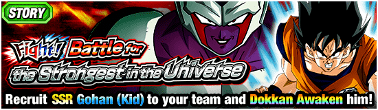 El "¡Lucha! ¡Lucha por el más fuerte del universo!" ¡El evento de la historia ya se puede jugar! ¡Incluya tantos personajes de la categoría especificada en su equipo como sea posible para maximizar la cantidad de objetos que suelta el jefe! ¡También puedes reclutar al nuevo personaje de SSR [Corazón alegre y recto] Gohan (Niño) y luego Dokkan Awaken con las Medallas del Despertar disponibles en este evento!