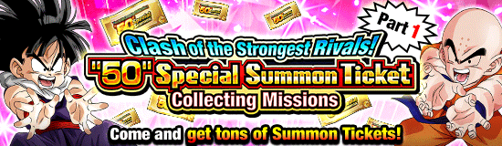 ¡La parte 1 de "Clash of the Strongest Rivals! "50" Special Summon Ticket Collecting Missions" ya está aquí! ¡Completa las misiones del evento para obtener increíbles recompensas como boletos de invocación especial "50" y más! Todas estas misiones de eventos están relacionadas con "¡Lucha! ¡Lucha por el más fuerte del universo!" evento mencionado anteriormente! Más de estas misiones están programadas para ser lanzadas en los próximos días, ¡así que complete misiones en todas las partes para recolectar cincuenta de los "50" boletos de invocación especial! ¡Luego, use sus boletos recolectados para jugar la "Celebración de la campaña mundial! "50" Invocación especial". Jugar esta convocatoria con cincuenta boletos te garantiza un personaje que puede ser Dokkan Awakened en un LR, ¡así que no te pierdas esta extraordinaria oportunidad de fortalecer tus equipos!