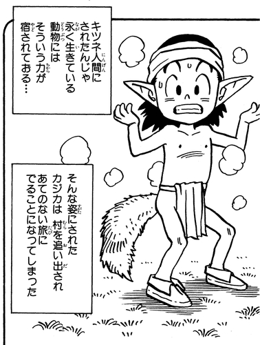 Un día, asesinó a un zorro llamado Gigi y, en un acto final de venganza, el espíritu del zorro maldijo a Kajika y lo convirtió en un ser mitad humano, mitad zorro.
