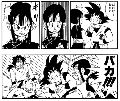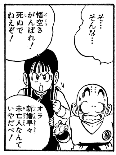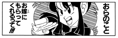 ¡Incluso comenta que cuando él está a punto de enfrentarse a Piccolo , ella acaba de casarse y que es demasiado pronto para enviudar!