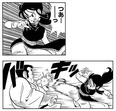 Indignada porque Goku se había olvidado por completo de su promesa de casarse con ella, ¡ella sale balanceándose desde el principio con una asombrosa ráfaga de ataques! Sin embargo, al final es derrotada cuando Goku usa una onda de choque para empujarla fuera de la arena.