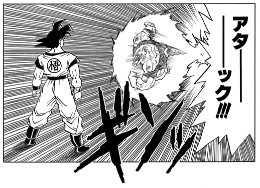 Sin embargo, Goku finalmente puede derribar al bruto con un codazo bien colocado en el pecho, derribándolo de una vez por todas.