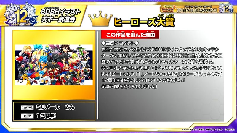 El ganador del Gran Premio de los Héroes fue la creación de la participante Miribaru titulada simplemente "¡12º Aniversario!"