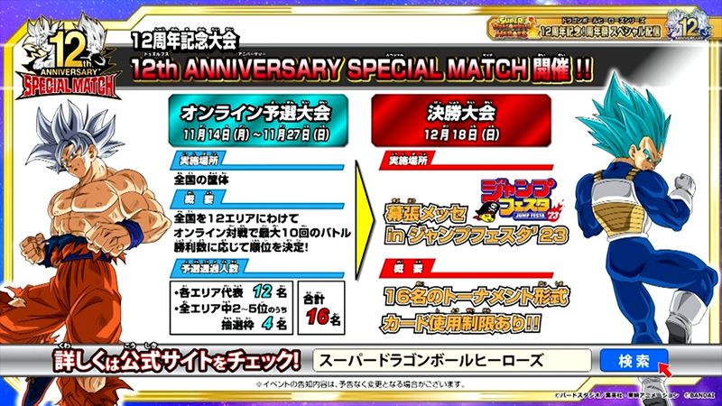 Dragon Ball Heroes es una serie donde los fanáticos pueden disfrutar de intensas batallas de Dragon Ball en forma de un juego de cartas digital. Este año, la serie celebró su 12.º aniversario, y más de 1200 millones de tarjetas en circulación, con el evento Anniversary Festival el 23 de octubre.