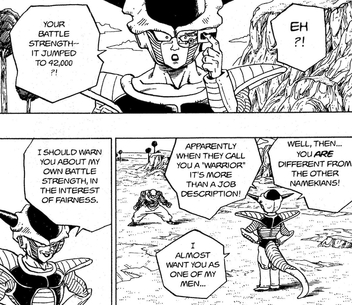 ▲ A pesar del hecho de que Frieza se enfrenta a un adversario en la escena anterior, reconoce amablemente el poder que posee su oponente. Otra característica del liderazgo es estar siempre a la caza de nuevos talentos.