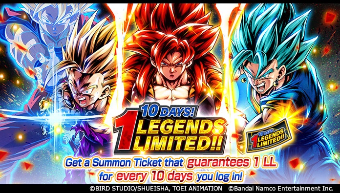 Por cada 10 días que inicie sesión, obtendrá un "¡10 DÍAS! ¡1 LEYENDAS LIMITADAS! ¡¡ Boleto de invocación ", que le garantizará un personaje de LEYENDAS LIMITADAS! Cuantas más invocaciones juegues y cuanto más avances a través de los pasos, ¡más personajes increíbles se agregarán a la alineación! ¡Inicie sesión 40 días para obtener el máximo de cuatro "10 DÍAS! ¡1 LEYENDAS LIMITADAS! Boletos de invocación"!