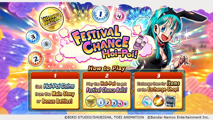 ¡Consigue monedas Hoi-Poi Festival Chance #1 superando ciertas etapas de batalla o con recompensas de misiones! En este Hoi-Poi, aparecerán Festival Chance Balls de diferentes rangos que van del 5 al 1, más un rango especial por encima de eso. ¡El premio especial se puede canjear por artículos increíbles, como Chrono Crystals, nuevas fundas de tarjetas de arte y Multi-Z Power 100 (LEGENDS LIMITED/SPARKING)! ¡Juega este Hoi-Poi una y otra vez y obtén el premio especial para ti!