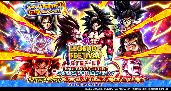 ¡El nuevo personaje de etiqueta de Legends, LEGENDS LIMITED Super Saiyan 4 Goku & Vegeta (DBL53-01S), se une a la lucha en este increíble Step-Up Summon! ¡Todos los pasos tienen el doble de Z Power Up normal junto con una tasa de caída de personajes del 30% SP, y el sexto paso es una Invocación Consecutiva gratuita!
