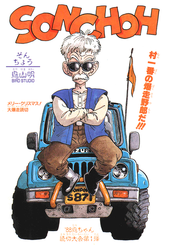 Sonchoh apareció como parte del evento "Merry Christmas! A Barrage of One-Shot Manga" de Shonen Jump de Weekly que estaba destinado a celebrar que la revista tenía 4,85 millones de números en circulación. Sonchoh es en gran parte una larga secuencia de persecución de automóviles protagonizada por el anciano de Pon-Pon Village, que conduce su automóvil favorito en busca de cualquier inútil. Esta historia le dio a Toriyama la oportunidad de dibujar algo que ama: los autos. ¡Así que es natural que las escenas de persecución realmente tengan un gran impacto!