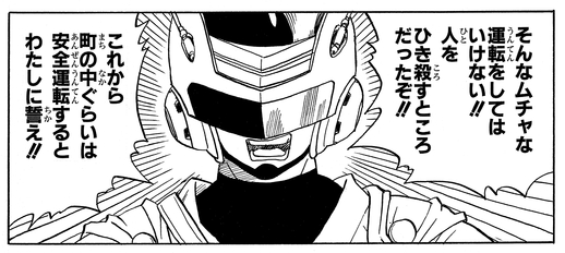¡Para proteger la santidad de su pueblo, ninguna infracción, por pequeña que sea, puede quedar impune! El fuerte sentido de justicia de este anciano es bastante similar al de otro héroe: ¡ Great Saiyaman!