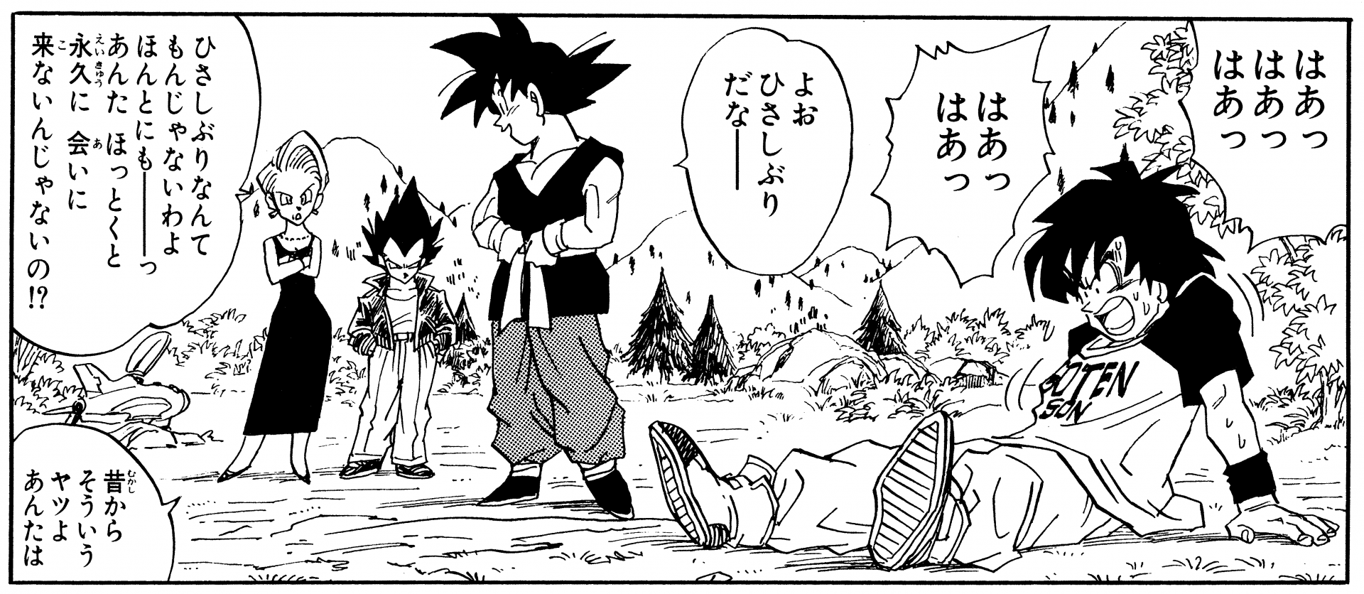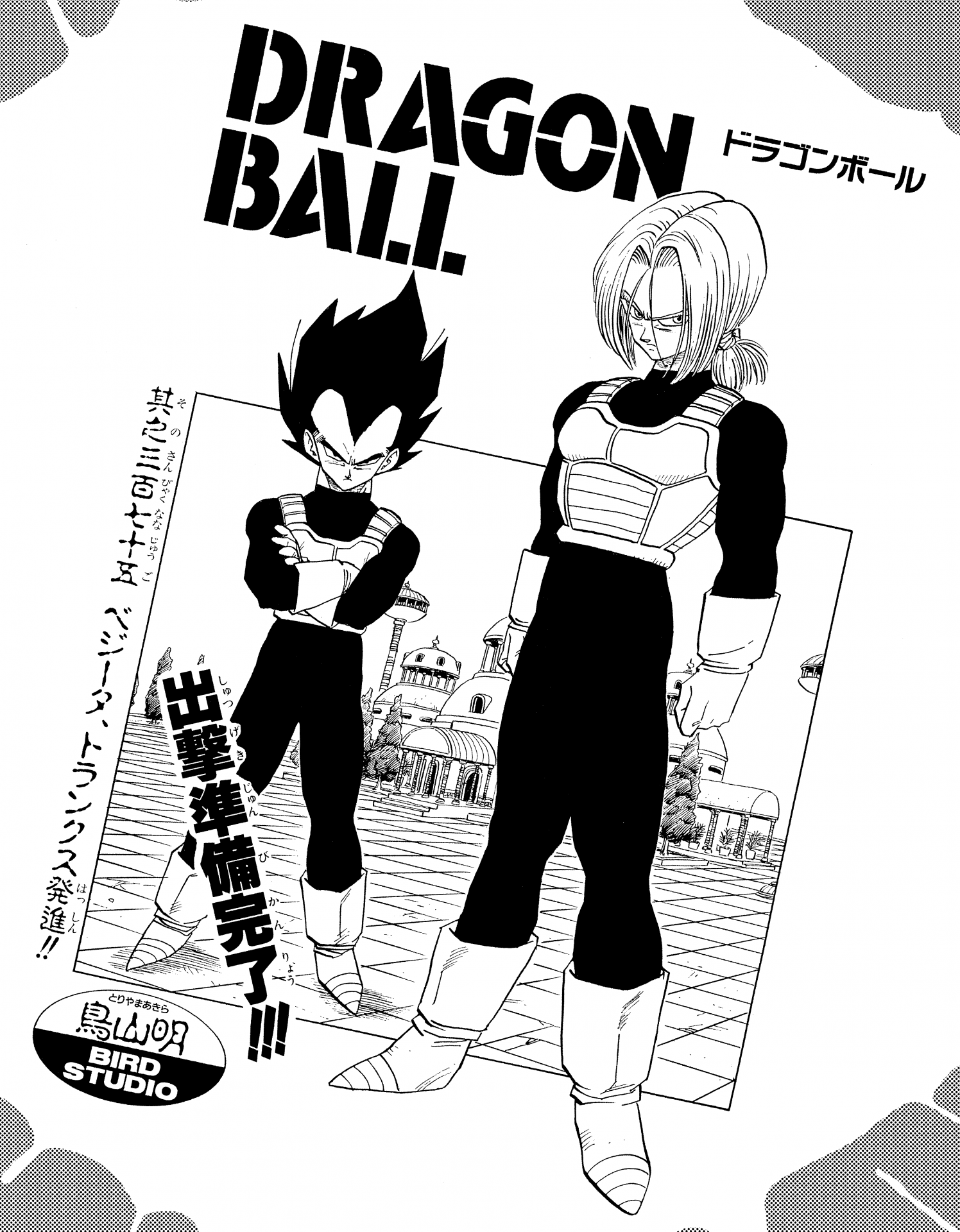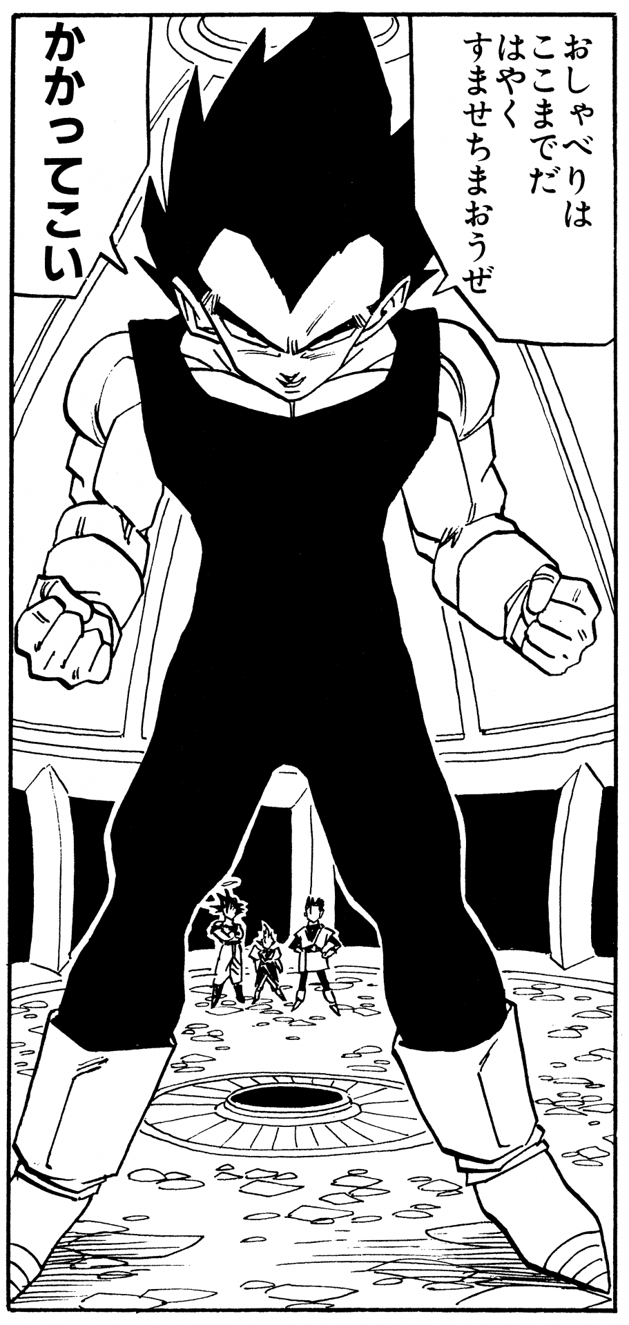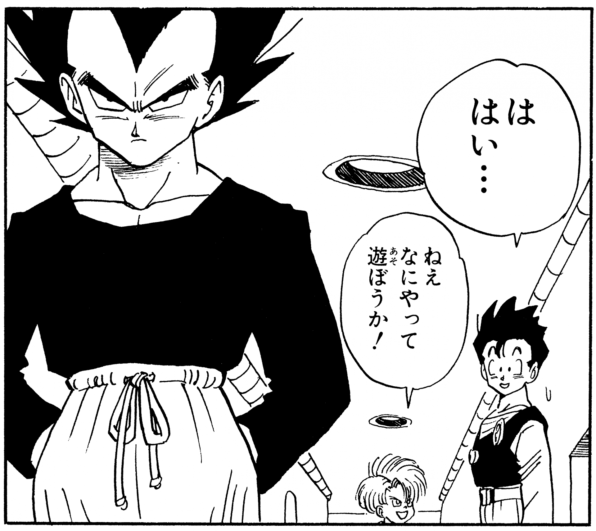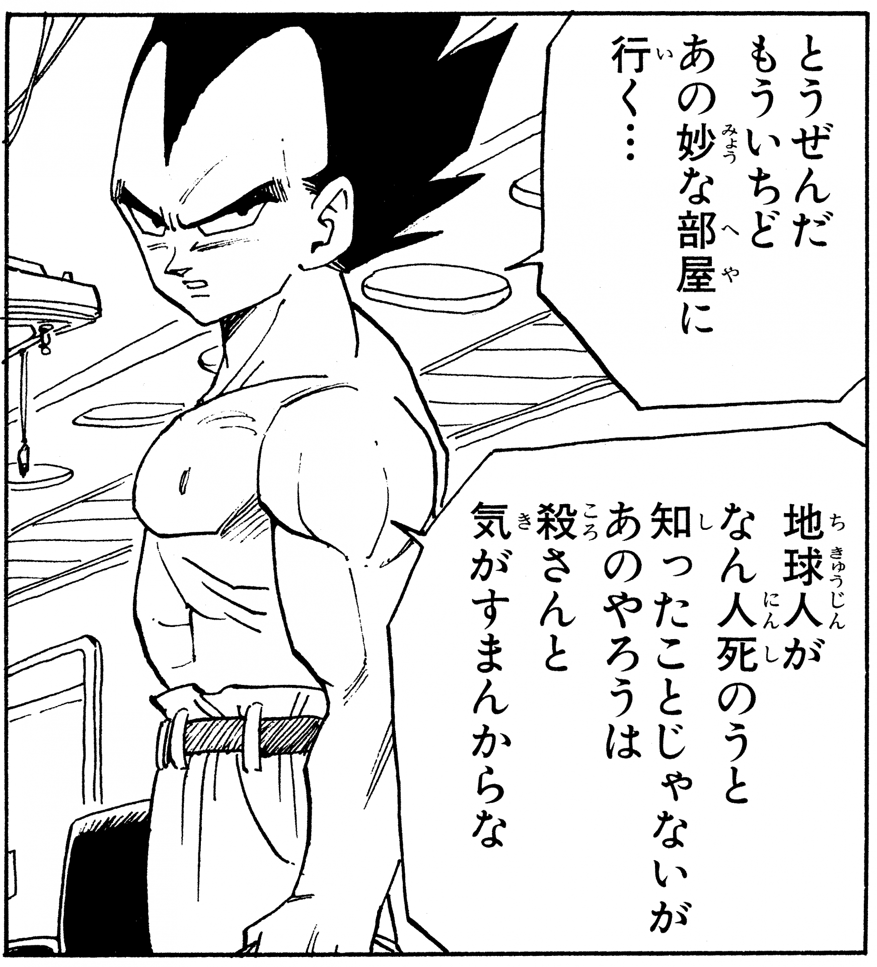 Aquí tenemos un solo panel de Vegeta años después de que Cell fuera derrotado luciendo bastante casual en su propia casa luciendo una camiseta negra y un par de pantalones holgados con un cordón alrededor de su cintura.