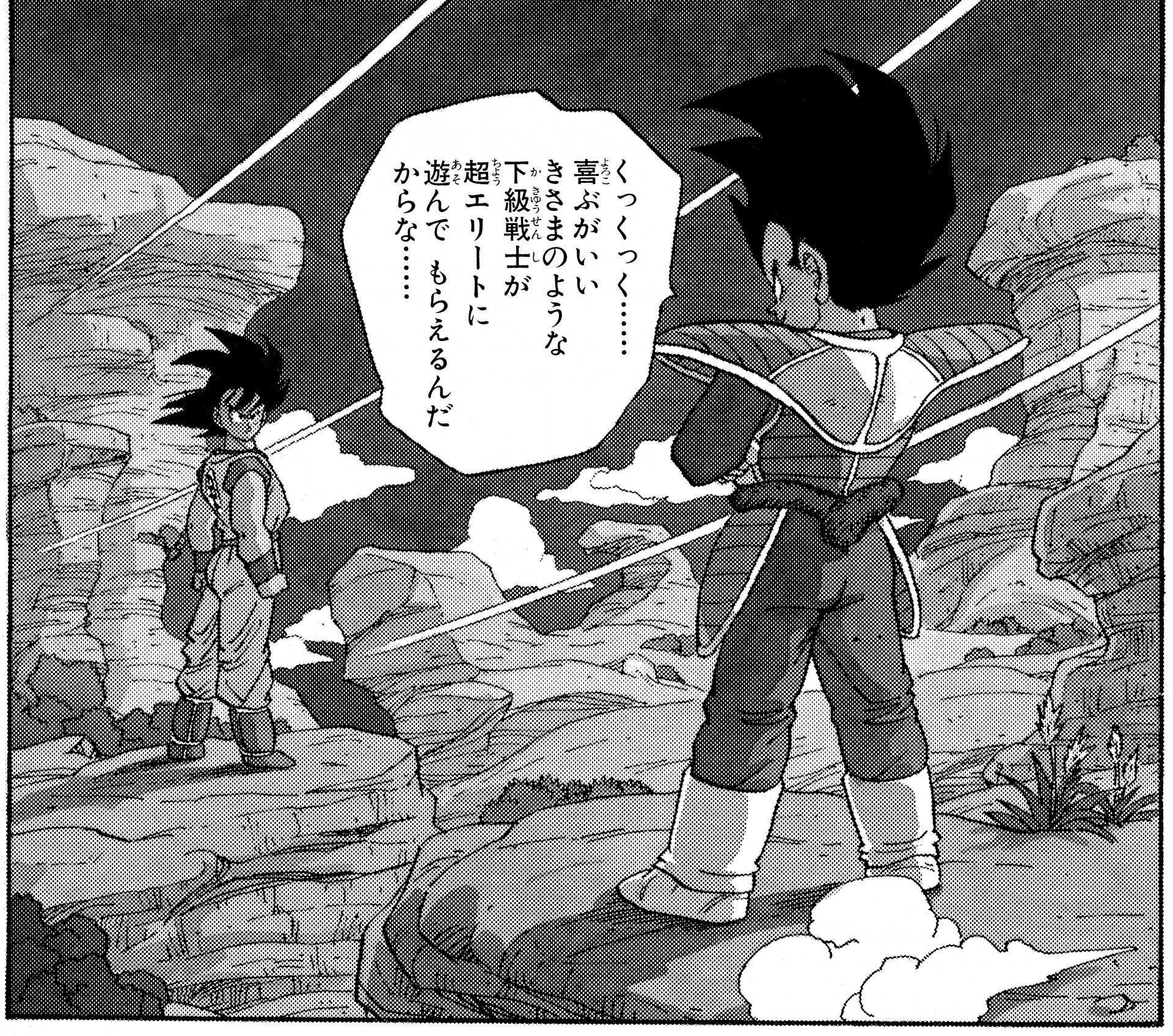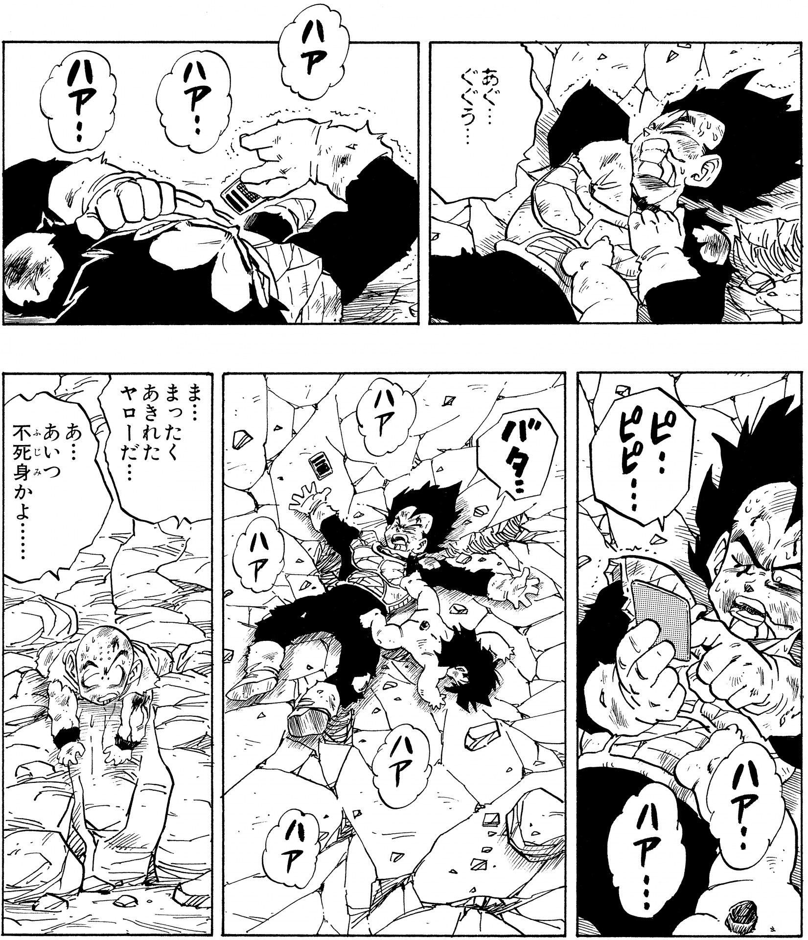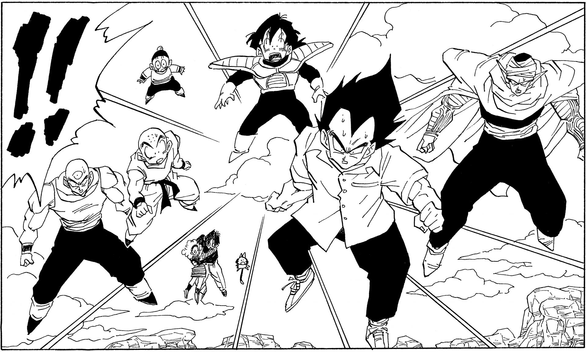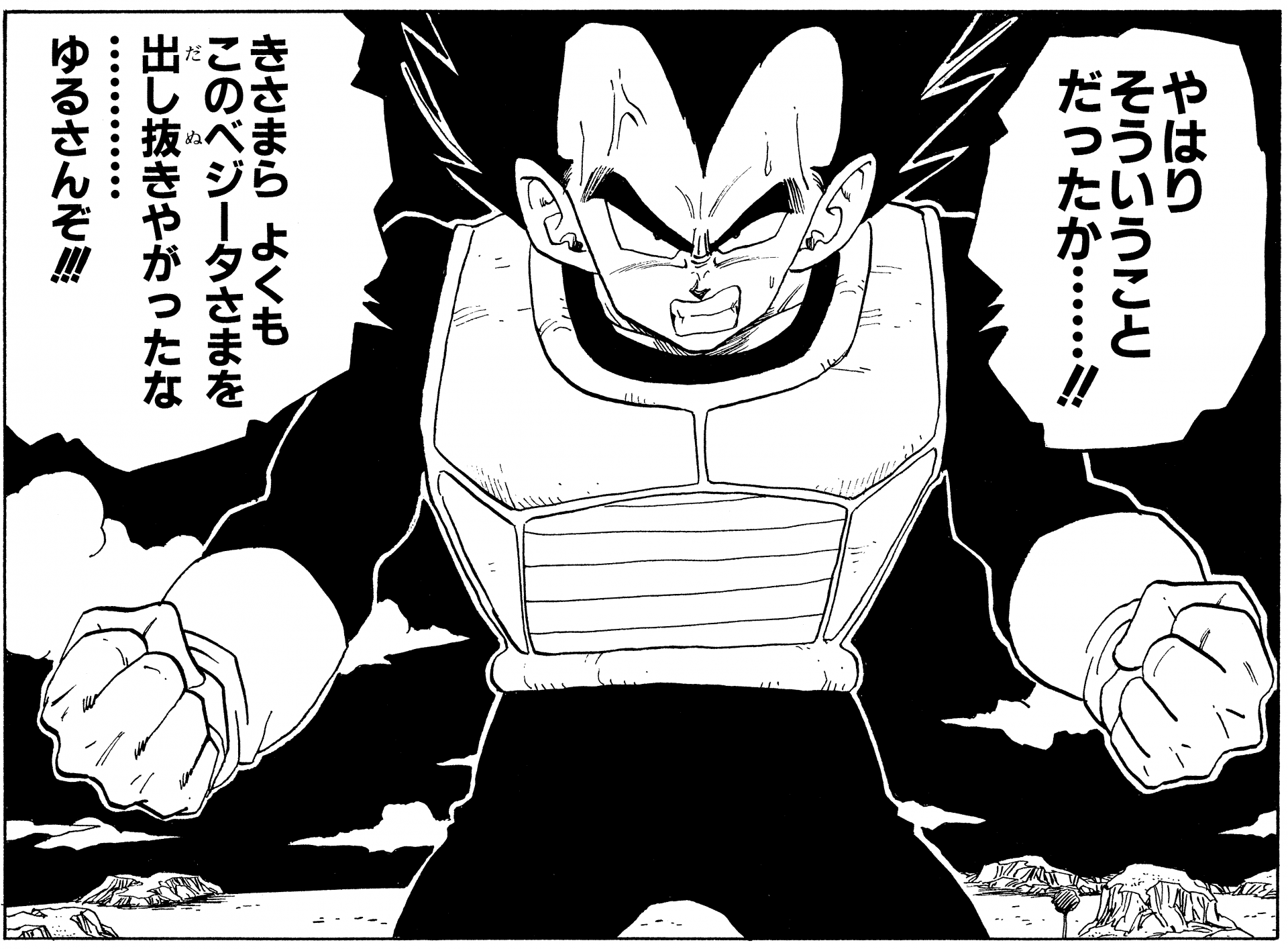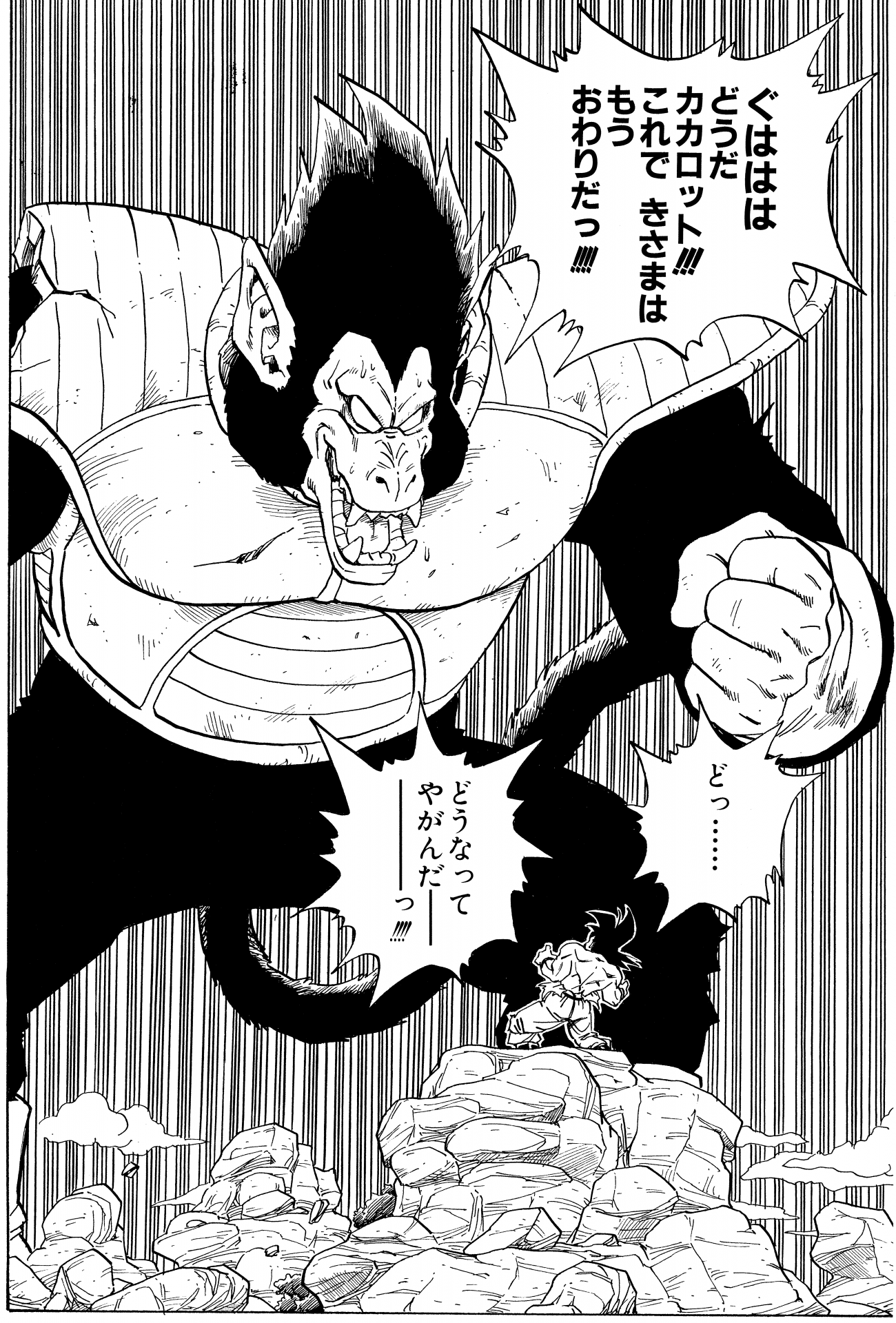 Aquí tenemos un solo panel de Vegeta años después de que Cell fuera derrotado luciendo bastante casual en su propia casa luciendo una camiseta negra y un par de pantalones holgados con un cordón alrededor de su cintura.