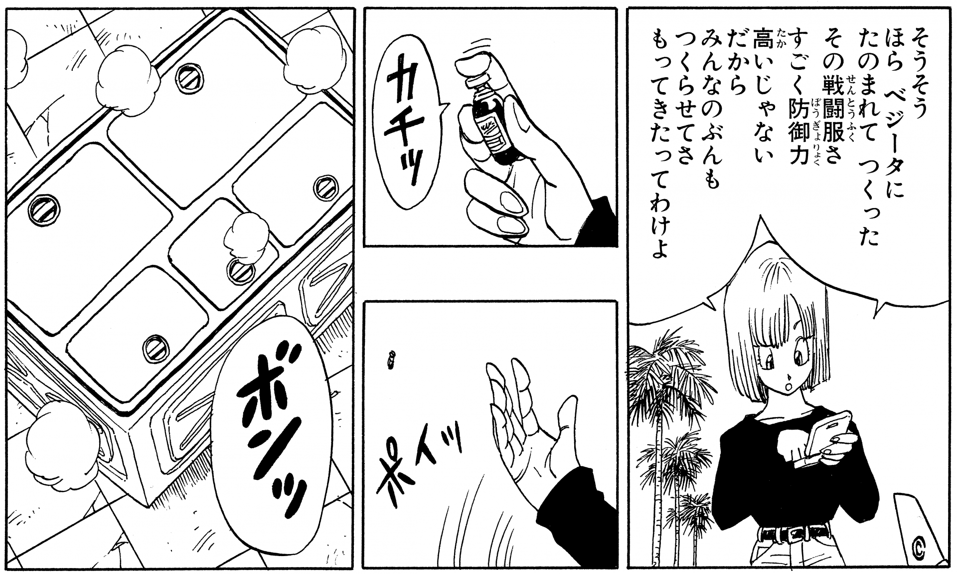 El chaleco alberga un pequeño dispositivo de comunicación que no se romperá incluso si se golpea con la fuerza de un Genki-dama, lo que lo convierte en una maravilla de funcionalidad y durabilidad. Y gracias al material de goma de alta calidad que se usa tanto en el chaleco como en el mono, todo el conjunto puede encogerse o expandirse para adaptarse a las necesidades de su usuario, por lo que el conjunto pudo crecer con Vegeta cuando se transformó en un Great Ape.