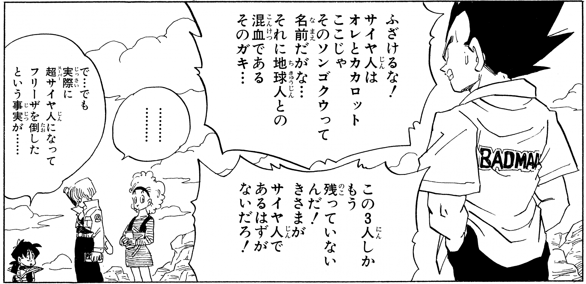 Se podía ver a Vegeta luciendo atuendos más interesantes después de que comenzó a estrellarse en Capsule Corporation. Esta es la ropa con la que se dirigió cuando Frieza y King Cold hicieron una visita a la Tierra. La camiseta fue particularmente memorable por ser un poco grande, rosa y tener la palabra "BADMAN" escrita en la espalda. Bulma también se veía fabulosa con su cabello recogido en una larga permanente en ese momento. ¿Quizás hay algo acerca de vivir en West City que hace que la gente quiera vestirse para impresionar?