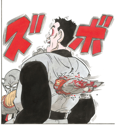A pesar de toda su determinación y valentía, este guardia de élite encuentra trágicamente su final cuando el Great Demon King Piccolo lo empala con un golpe despiadado en el corazón.