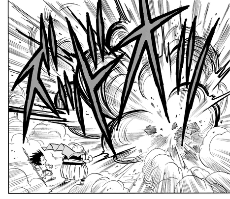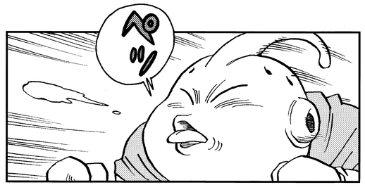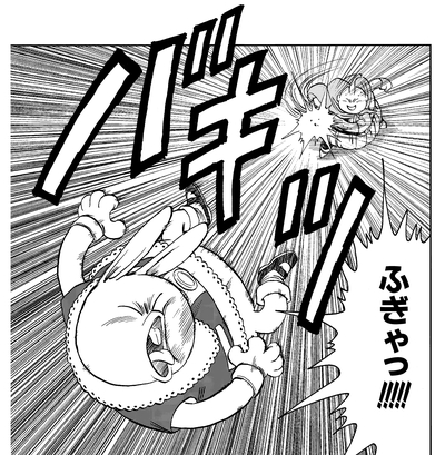 ¡En un instante, Majin Buu aterriza en la escena como un superhéroe aquí para salvar el día! Confundiendo a Usa Majin con Neko Majin, ¡ Majin Buu desata un golpe que hace temblar la Tierra y hace que el villano salga disparado hacia atrás!