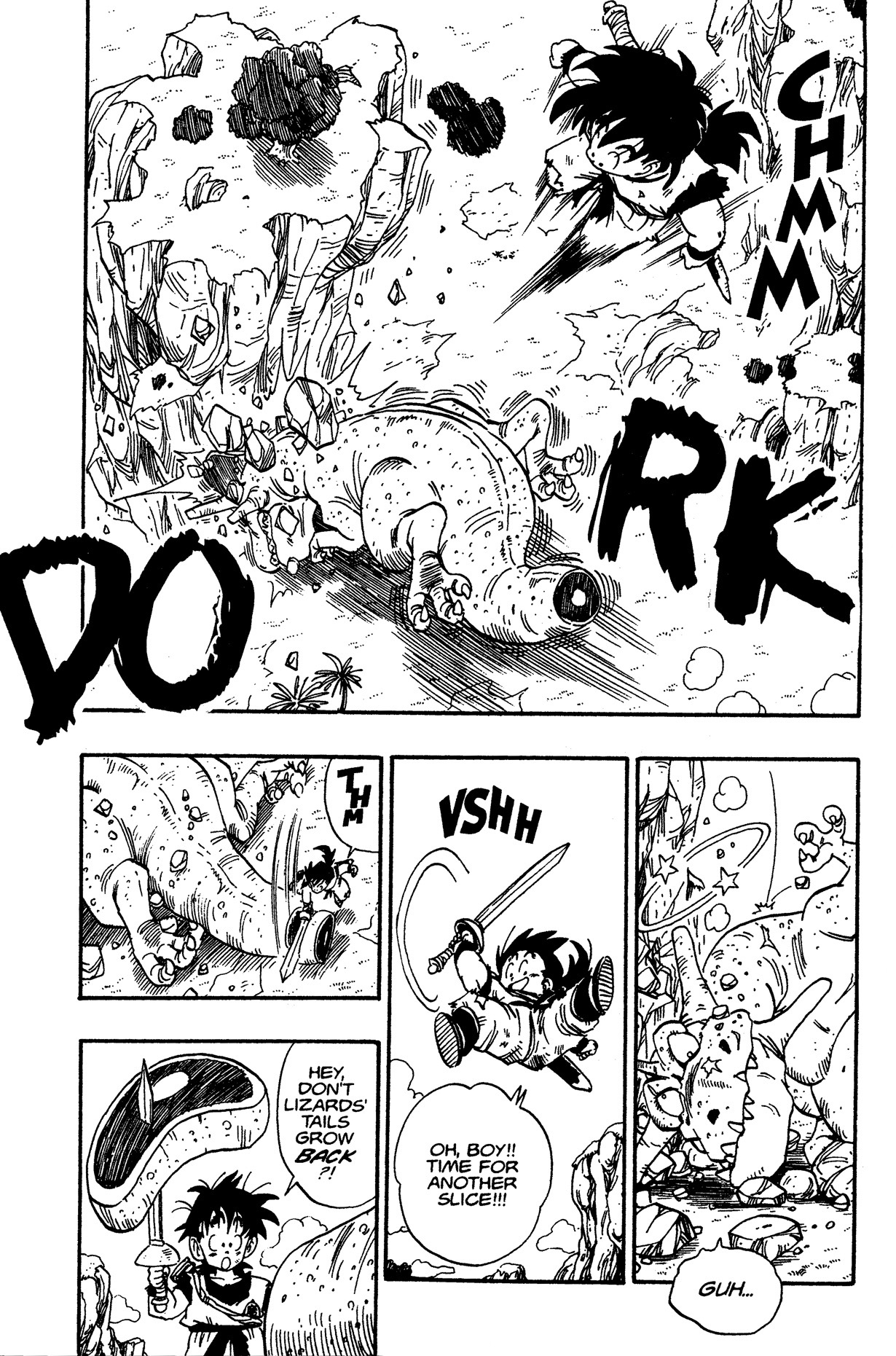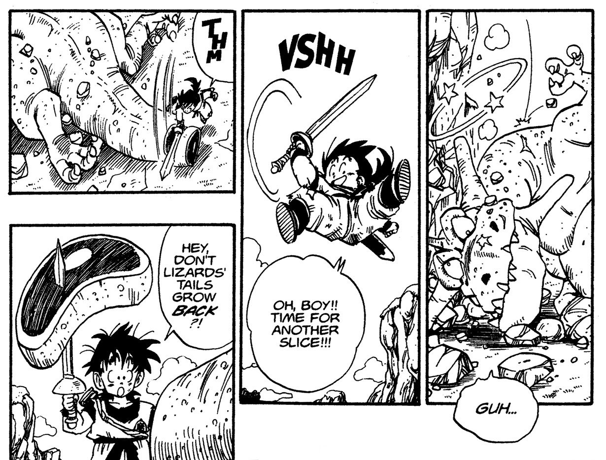 — Más tarde, Gohan logra cortar un gran trozo de la cola del dinosaurio con su espada.