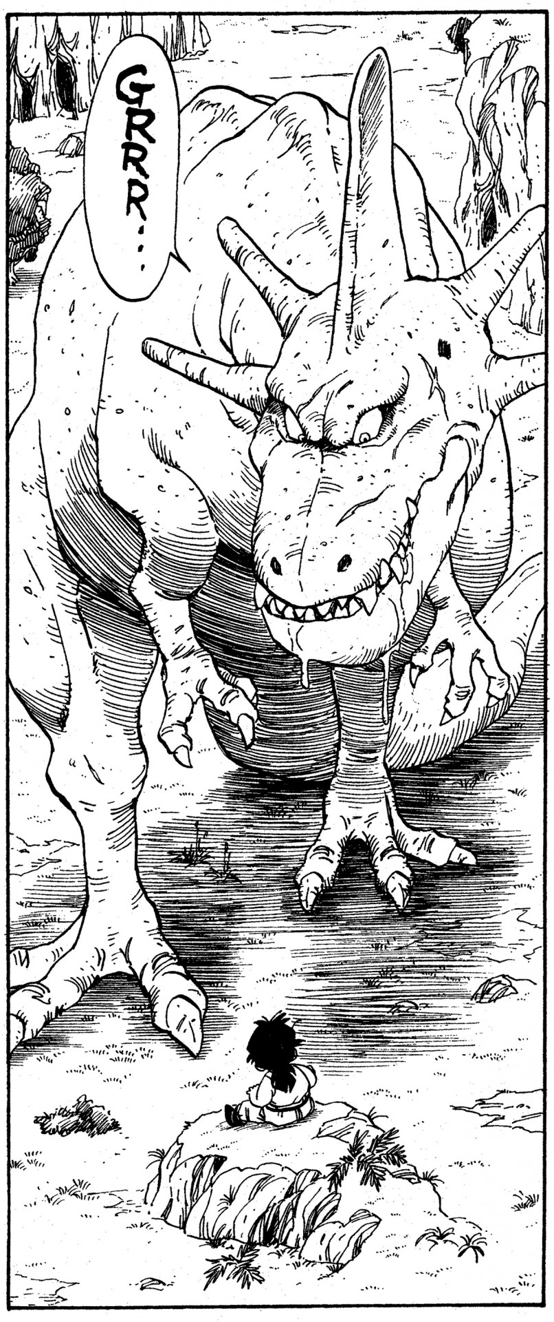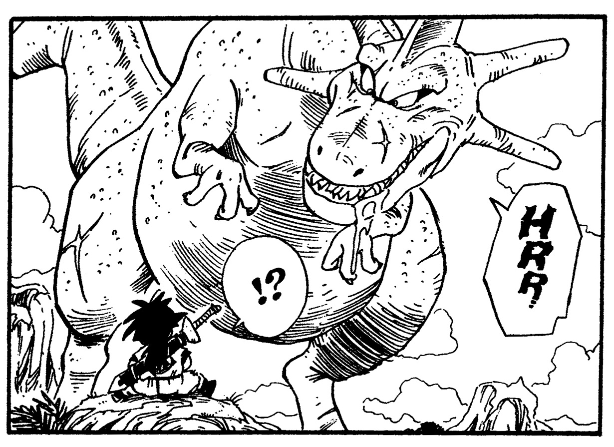 — Hemos hablado un poco sobre la carne de dinosaurio, así que a continuación me gustaría preguntarte sobre la biología de este dinosaurio. Se muestra que Gohan puede escapar del dinosaurio huyendo, pero ¿sería esto posible para los humanos normales? O, ¿Gohan es realmente tan increíble?