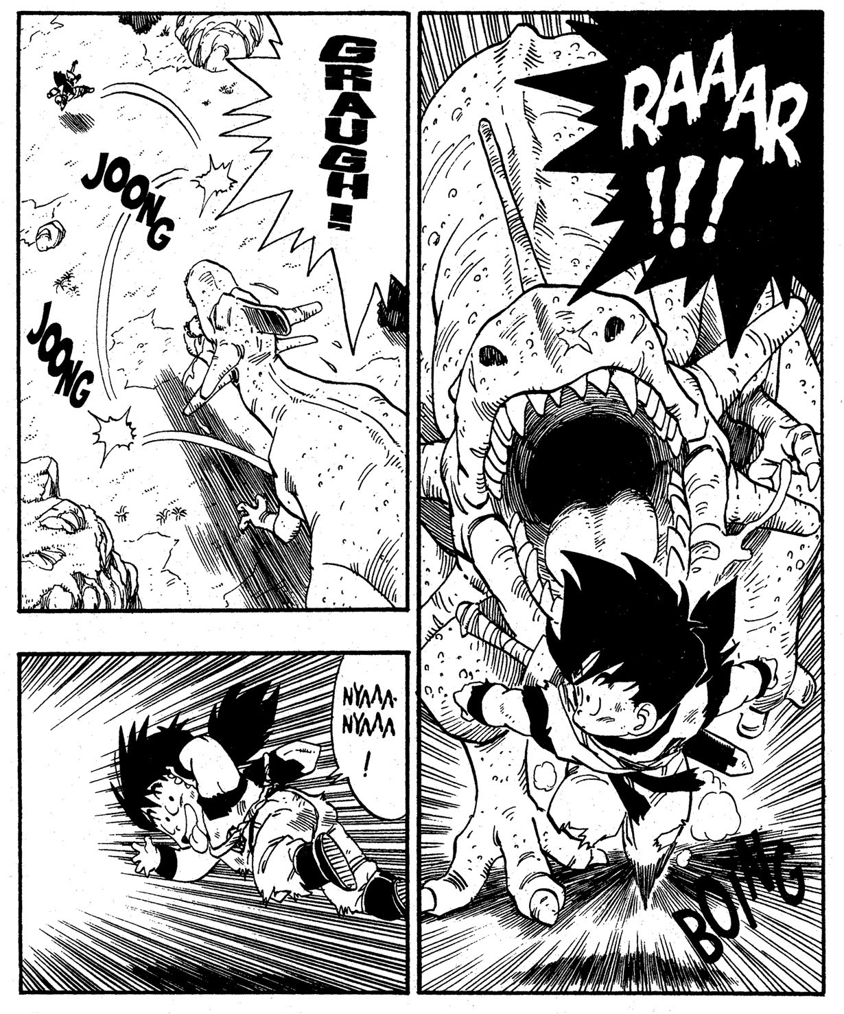 — Lo que es más, este aspirante a matón de dino incluso pareció tomarse su tiempo para perseguir a Gohan, haciendo todo lo posible para moverse e intimidar al bebé primero.