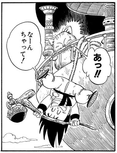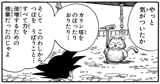 Karin incluso logra deslizar la Esfera del Dragon Ball de Cuatro Estrellas de Goku y arrojarla por el borde para obligar a Goku a recuperarla y escalar la torre una vez más como entrenamiento.