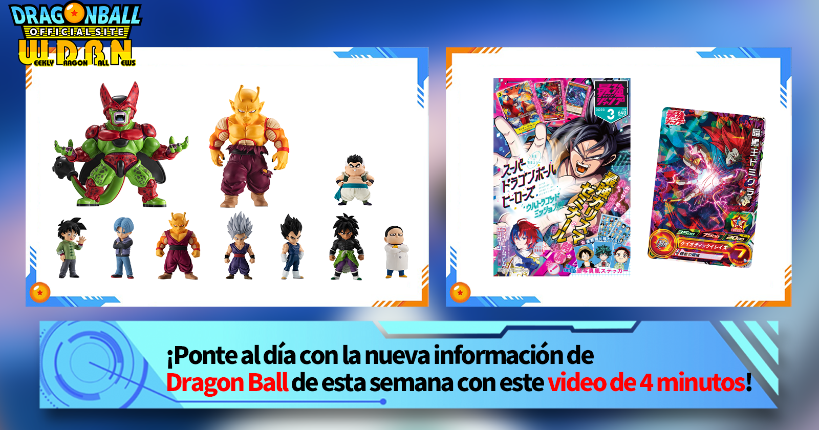 "Noticias semanales de Dragon Ball" es una serie de videos actualizada todos los lunes (JST) para brindarle las últimas noticias en el mundo de Dragon Ball. ¡Únase al editor de V Jump , Victory Uchida, mientras cubre toda la información más reciente publicada la semana anterior, así como nuevas actualizaciones como información de nuevos productos y noticias del sitio para la próxima semana!