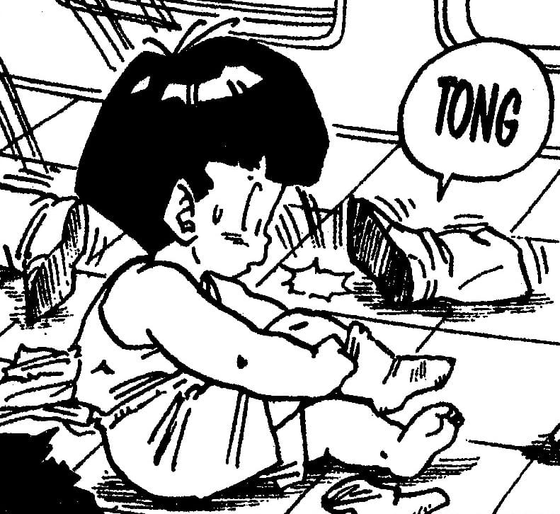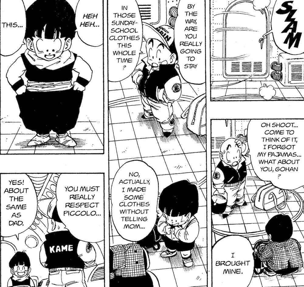・La escena en la que Gohan aparece en el barco que se dirige a Namek con un corte de tazón y Krillin dice que su atuendo parece ropa de escuela dominical. Además, la escena en la que se quita los calcetines para ponerse su armadura de batalla. ¡Muy lindo!