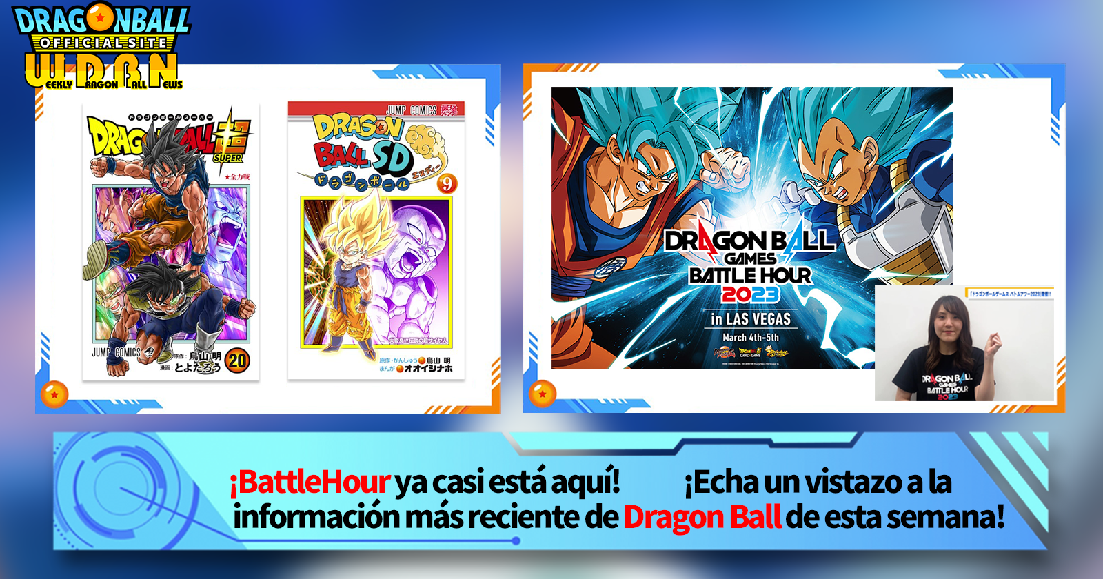 "Noticias semanales de Dragon Ball" es una serie de videos actualizada todos los lunes (JST) para brindarle las últimas noticias en el mundo de Dragon Ball. ¡Únase al editor de V Jump , Victory Uchida, mientras cubre toda la información más reciente publicada la semana anterior, así como nuevas actualizaciones como información de nuevos productos y noticias del sitio para la próxima semana!