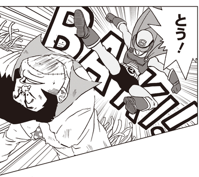 Afortunadamente para ellos, Krillin mantiene la cabeza fría y logra lanzar un Kienzan a través del punto débil del Dino-Droid #1 para bloquear su movimiento, dando a Trunks y Goten la oportunidad que necesitan para lanzar un poderoso ataque combinado y aplastarlo.