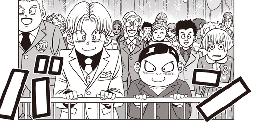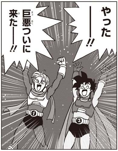 Frente a esta enorme y repentina nueva amenaza, Trunks y Goten están... ¡llenos de alegría!