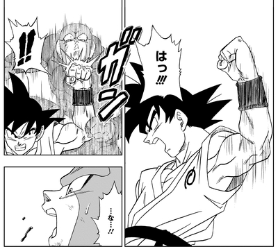 Luego, Goku dispara un Kamehameha que Hit apenas logra esquivar, lo que hace que el asesino reconozca su fuerza. Sin embargo, Goku de repente sale del ring voluntariamente y se descalifica a sí mismo, diciendo: "No puedo darme el lujo de perder esta oportunidad de ver pelear a nuestro mejor hombre", refiriéndose al miembro final del Universo 7, Monaka.