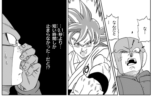 Usando su habilidad Time Skip que le permite congelar momentáneamente el tiempo y desatar ataques de alta velocidad, Hit puede evadir y contrarrestar todos los ataques de Vegeta.