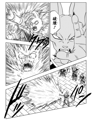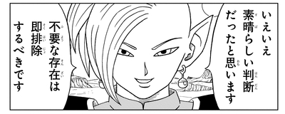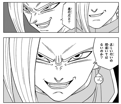 Zamasu declara: "Si mi plan ya ha tenido éxito en el futuro, eso hace que sea aún más seguro que no moriré ahora", y luego intenta por la fuerza iniciar su malvada misión en ese mismo momento, solo para encontrarse rápidamente destruido. por Beerus.